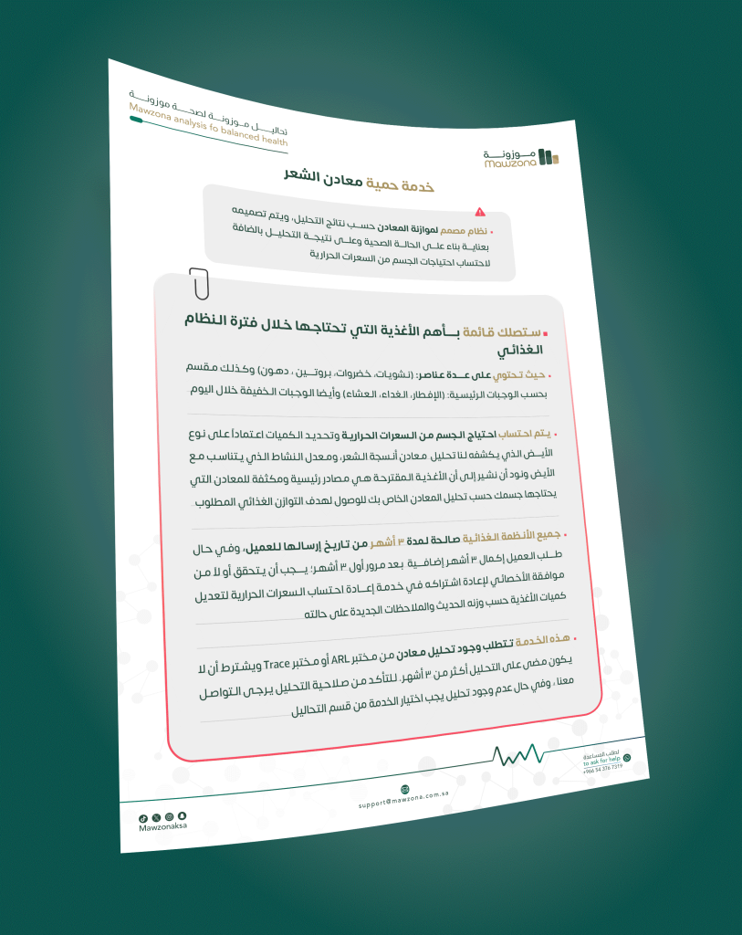 خدمة تحليل المعادن والسموم بالإضافة لنظام مصمم بخطة غذائية مقررة، وذلك لموازنة المعادن الخاصــة لك بناء على نتائج التحليــل، ويتم تصميمه بعنايــة بناء على الحالة الصحية وعلى نتيجة التحليــل