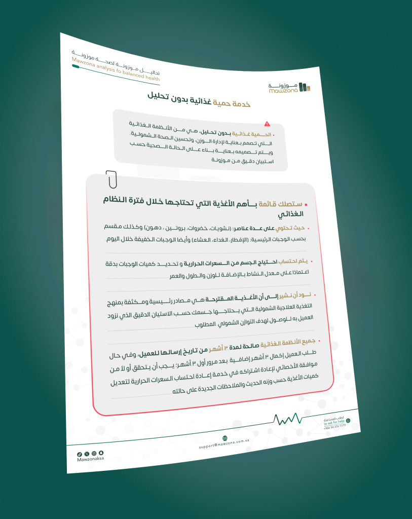 خدمة نظام مصمم بخطة غذائية مقررة بناء على الحالة الصحية ، بالإضافة لاحتساب احتياجات الجسم من السعرات الحرارية ويتم تصميمه بعناية بدون تحليل.